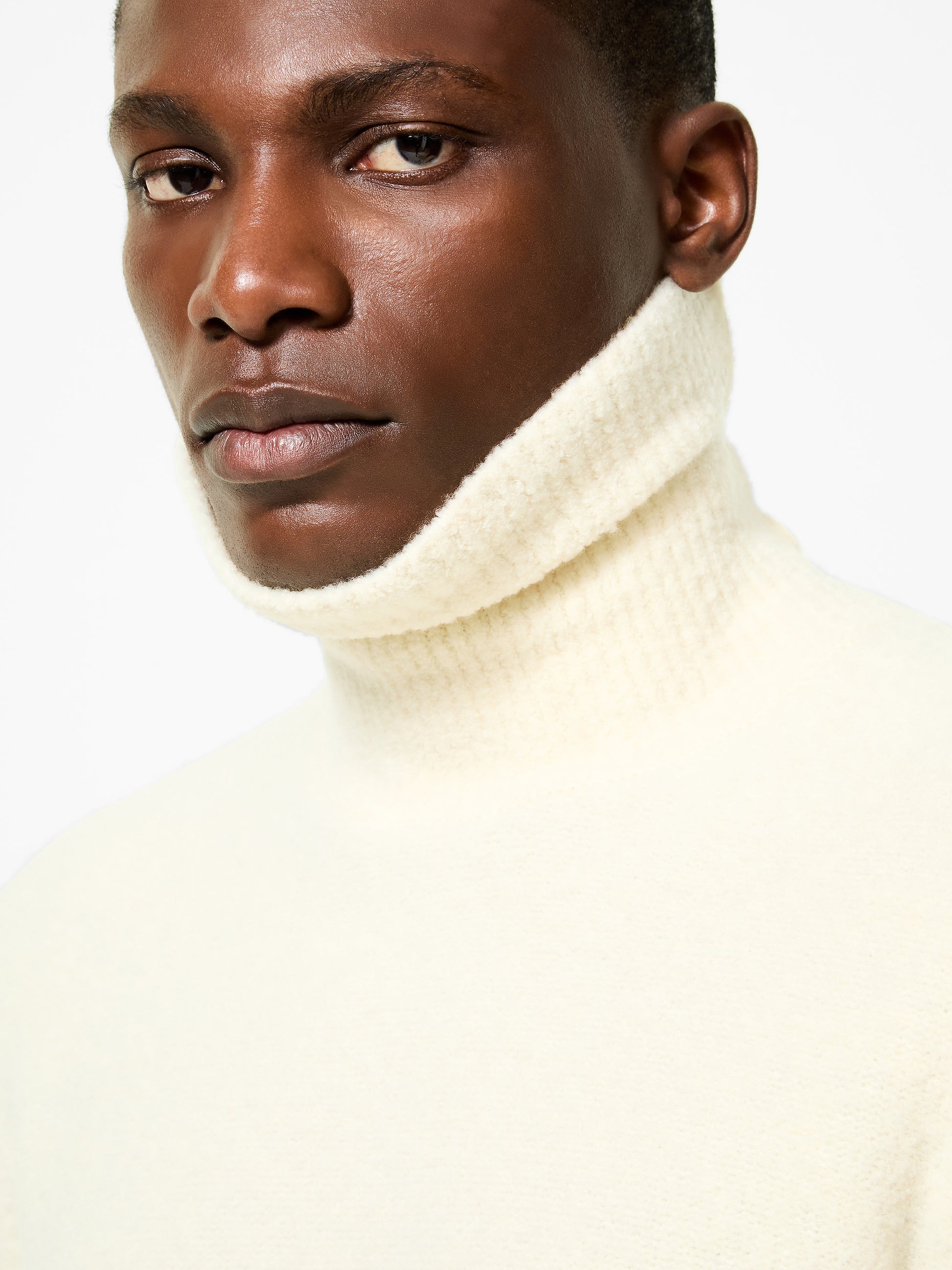 Snug and textured, this long-sleeved turtleneck sweater conveys an immediate sense of warmth and protection. Crafted from a fine stretch bouclé yarn in wool and nylon, it stands out for......