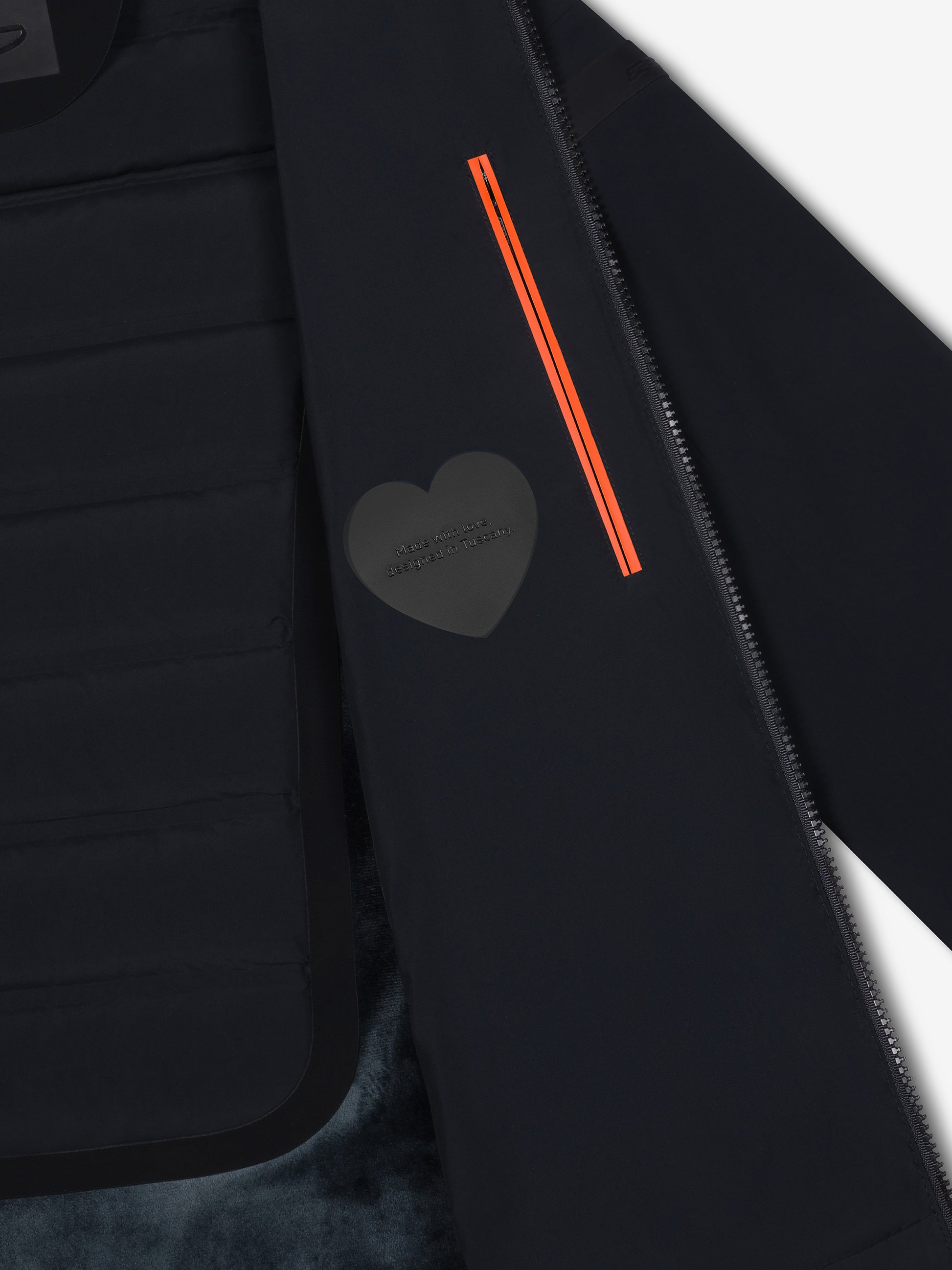 The composite hi-tech design confirms Montecristo Thermo Hybrid Hood Zip Jkt a versatile protagonist of the most intense mid-season days. Contemporary appeal and refined materials are highlighted on the front, back and fixed hood by inserts in the tubic channels, which enclose the 90/10 duck down padding without seams, for a texture without visual interruption. The stretch, lightweight and breathable membrane Stratofabric#3 provides maximum comfort and agility, while the super-matte look of the shell contrasts with the high-gloss finish of the tubic channels. The jacket features a full-length zipper with magnetic closure and invisible zippered side pockets. The wrap-around, adjustable drawstring hood protects the head. The warm, soft velvet lining features an invisible zipper breast pocket with neon orange double welt. The black micro-injected logo on the left sleeve is the signature of this urban-style jacket, available in this season's dark tones.