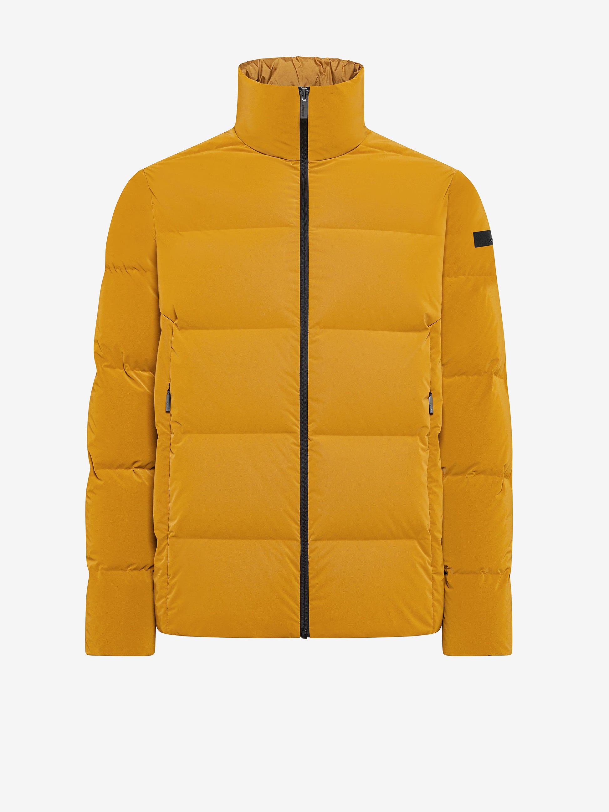 The design of this regular-fit, mid-length down jacket is defined by the width of silicone coated tubic channels with a subtle iridescent effect that define its crisp, contemporary look. The absence of stitching creates a visually seamless texture that enhances the garment's minimalism and prevents the extra warm and soft 90/10 duck down fill from escaping. The front features a zipper that rises to close the high, protective collar and invisible zippered side pockets. The contrasting black interior features a handy pocket that closes with an invisible zipper and is highlighted by the distinctive neon orange double welt and "Made with love, designed in Tuscany" heart tag. The black micro-injected logo on the left sleeve adds a stylish touch to this warm and lightweight jacket, ideal for cold winter days in the city or on the weekend.