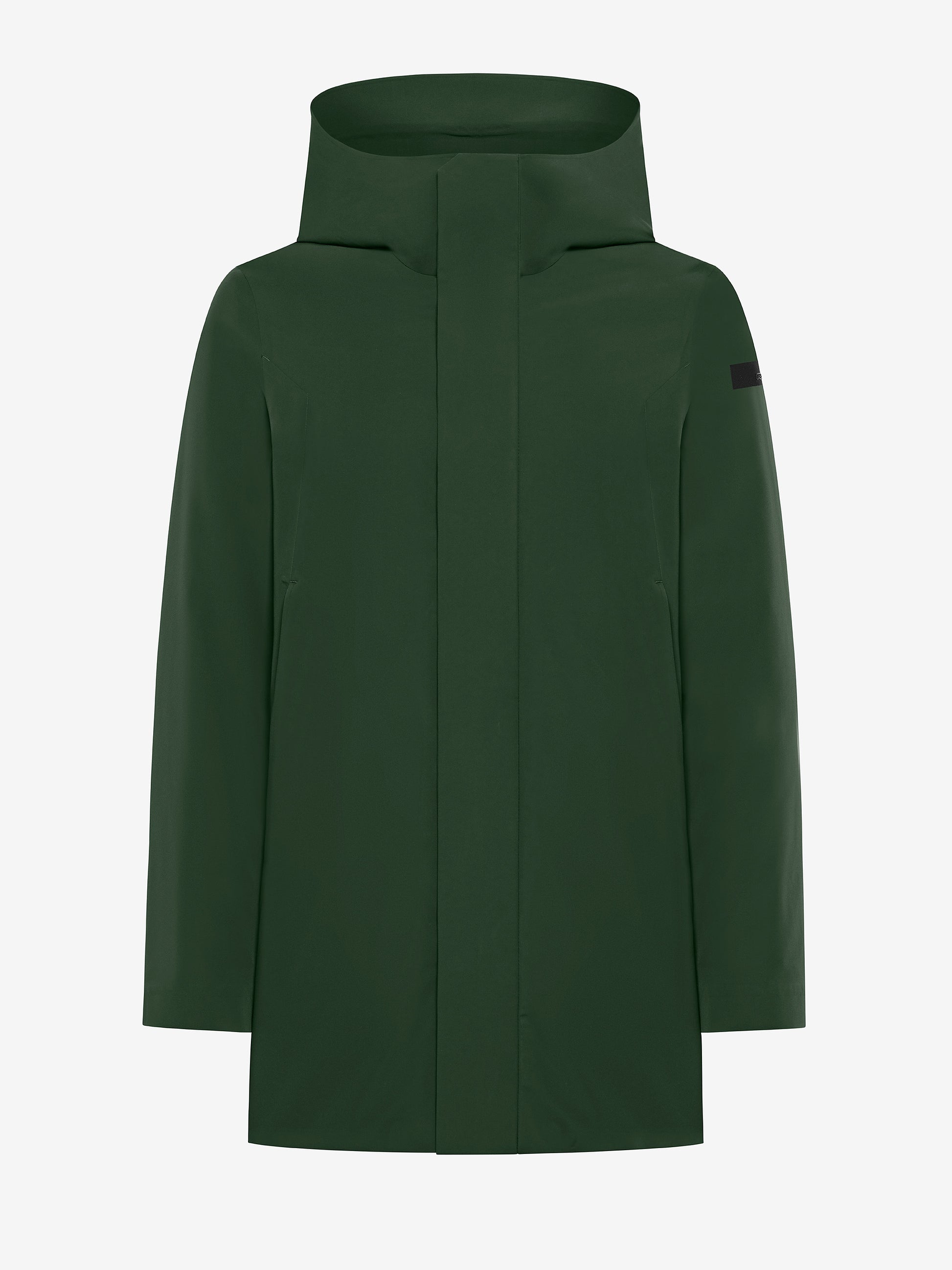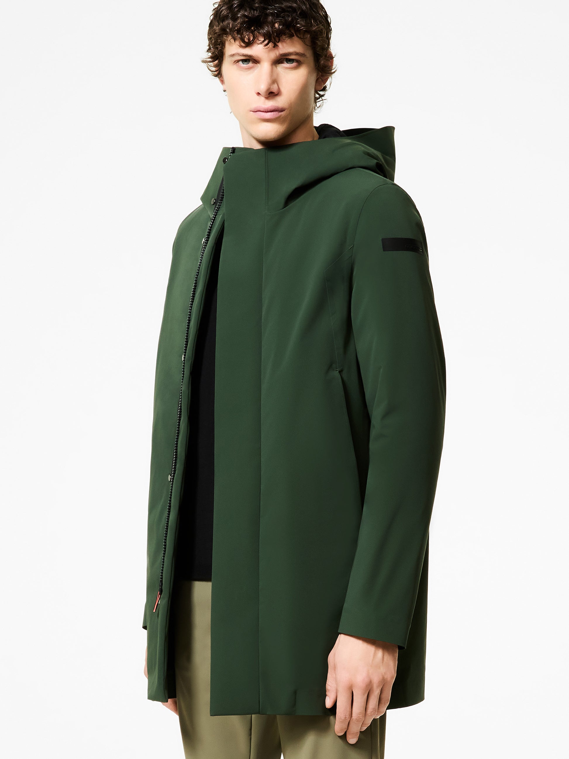 The classic winter wardrobe staple has been restyled with a design that combines exemplary simple elegance with a taste for construction and high-tech materials. Laser glue lock technology and the waterproof and breathable membrane Stratofabric#3 make this regular-fit outerwear particularly weatherproof. The wrap-around, padded hood provides additional head protection. The matte finish of the Montecristo shell accentuates the minimalist lines: the snap placket conceals the thermo-welded double metal zipper that rises to close the vertical collar. The two convenient side pockets are closed by glued coated zippers. Extremely warm, soft and lightweight, the 90/10 duck down padding is encased in the "square" tubic. The exclusive Floating Shield system increases comfort and ensures a perfectly straight fit. Inside, the parka features a concealed zippered breast pocket enlivened by the double orange welt and the signature "Made with love, designed in Tuscany" heart tag. The black micro-injected logo on the left sleeve adds a touch of class and versatility.