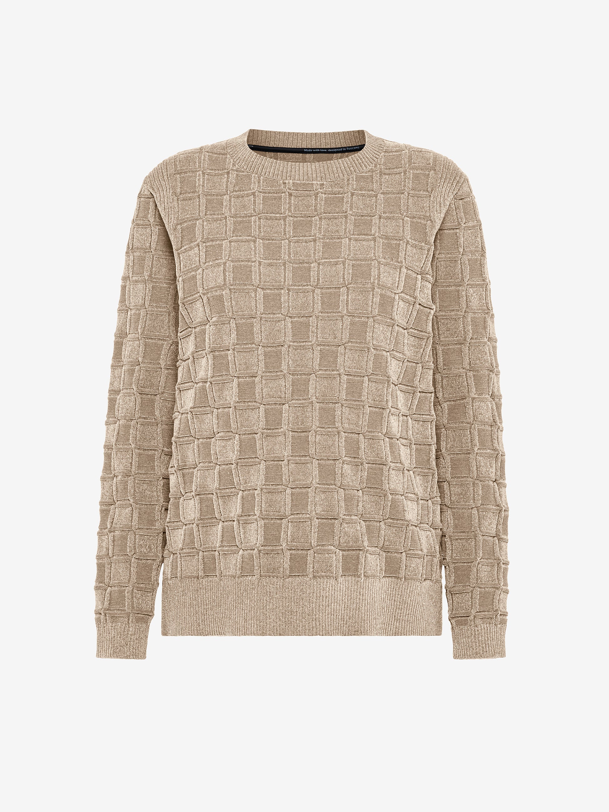 L'eleganza senza tempo risuona di una nota contemporanea in questo maglione jacquard a quadri tridimensionali, realizzato in filato velvet luminoso dalla texture avvolgente e confortevole. Le spalle a giro inglese delineano una silhouette decisa dal carattere urban glam. Pensato per uno stile dinamico e metropolitano, il capo si esprime al meglio se abbinato a un pantalone over in eco suede della Collezione, trasformandosi in un'icona di stile disinvolto e contemporaneo, ideale per affrontare con personalità le giornate più intense della stagione fredda.