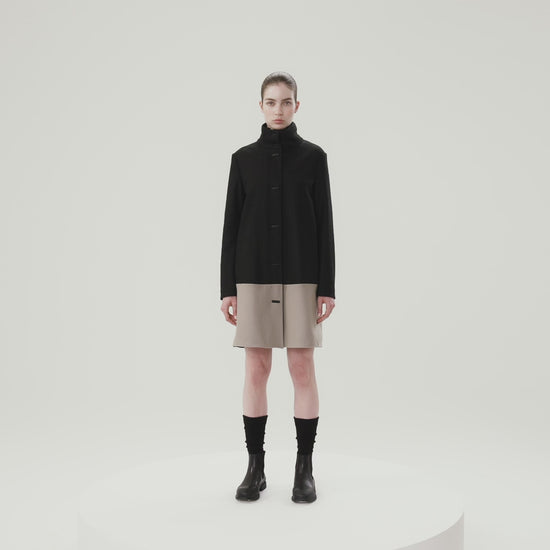 Il color block reinventa il classico cappotto monocromatico donando al modello un'inaspettata allure cozy chic. Il taglio essenziale, leggermente sopra il ginocchio, è valorizzato dal collo alto e avvolgente, che ne sottolinea il carattere di tendenza. Realizzato in caldo pregiato misto cashmere, Gae Coat Wom Jkt è una sintesi perfetta di classe e comfort. Sul davanti, la patta impreziosita dai bottoni a barretta soft touch nasconde la chiusura con zip a doppio cursore. Le tasche laterali invisibili enfatizzano il design pulito e raffinato. Per un outfit sofisticato ed elegante, la creazione può essere abbinata a un micro dress in velluto nel creare un mix di stili e finiture per la mezza stagione.