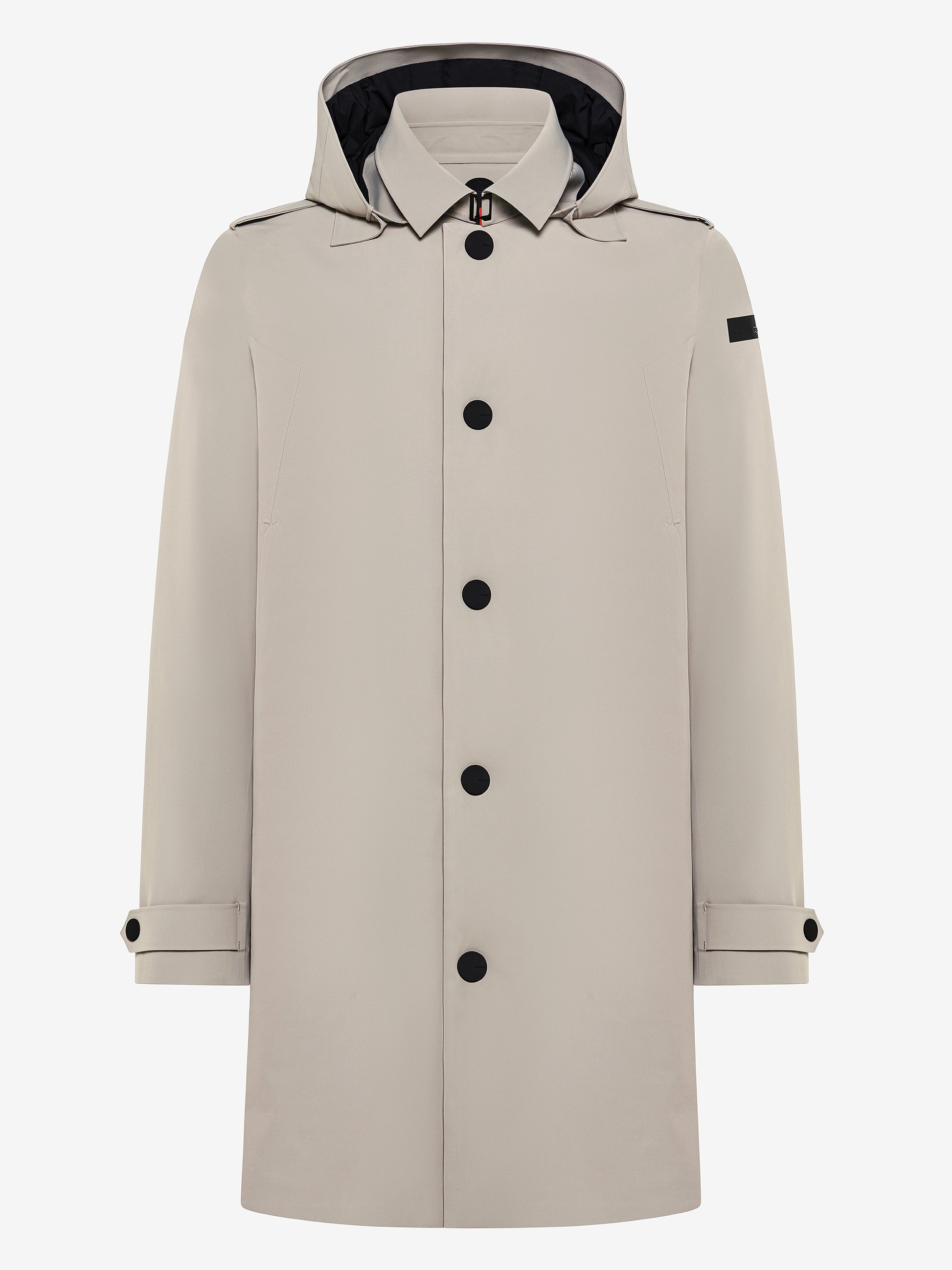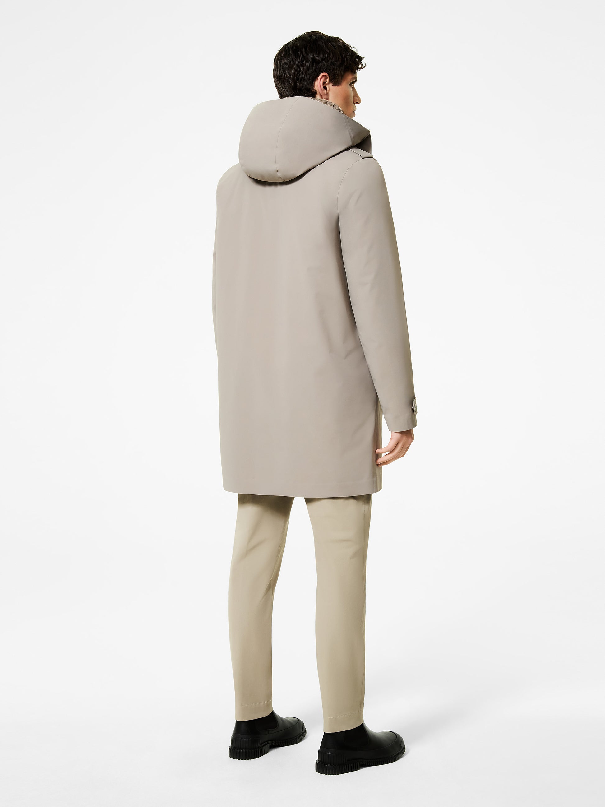 Il soprabito che ha scritto la storia sartoriale maschile è aggiornato in una chiave contemporanea e minimalista, con materiali hi-tech e dettagli inediti. Il capospalla si distingue per il cappuccio imbottito, staccabile tramite la zip nascosta dalla pattina. Questo dettaglio si aggiunge al colletto a camicia chiuso dal gancio metallico e alle spalline, che appartengono alla sua heritage militare. La costruzione Laser Glue Lock, totalmente priva di impunture, enfatizza il look minimalista e l'assoluta resistenza agli agenti atmosferici del tessuto a membrana Stratofabric#3, leggero e traspirante. I bottoni a pressione gommati neri sul davanti e sui polsi e le ampie tasche laterali con zip spalmate incollate sono gli elementi di design che spiccano sul look opaco dell'esterno in tessuto Montecristo, dal touch liscio. L'imbottitura in soffice piuma d'anatra 90/10 è contenuta nei canali tubici "square" del sistema Floating Shield, che enfatizza il comfort e dona una vestibilità impeccabile al taglio leggermente a trapezio. L'interno è completato dal taschino con zip invisibile, impreziosito dal doppio filetto arancione fluo e dall'iconica tag a cuore "Made with love, designed in Tuscany". Logo a microiniezione nero sulla manica sinistra.