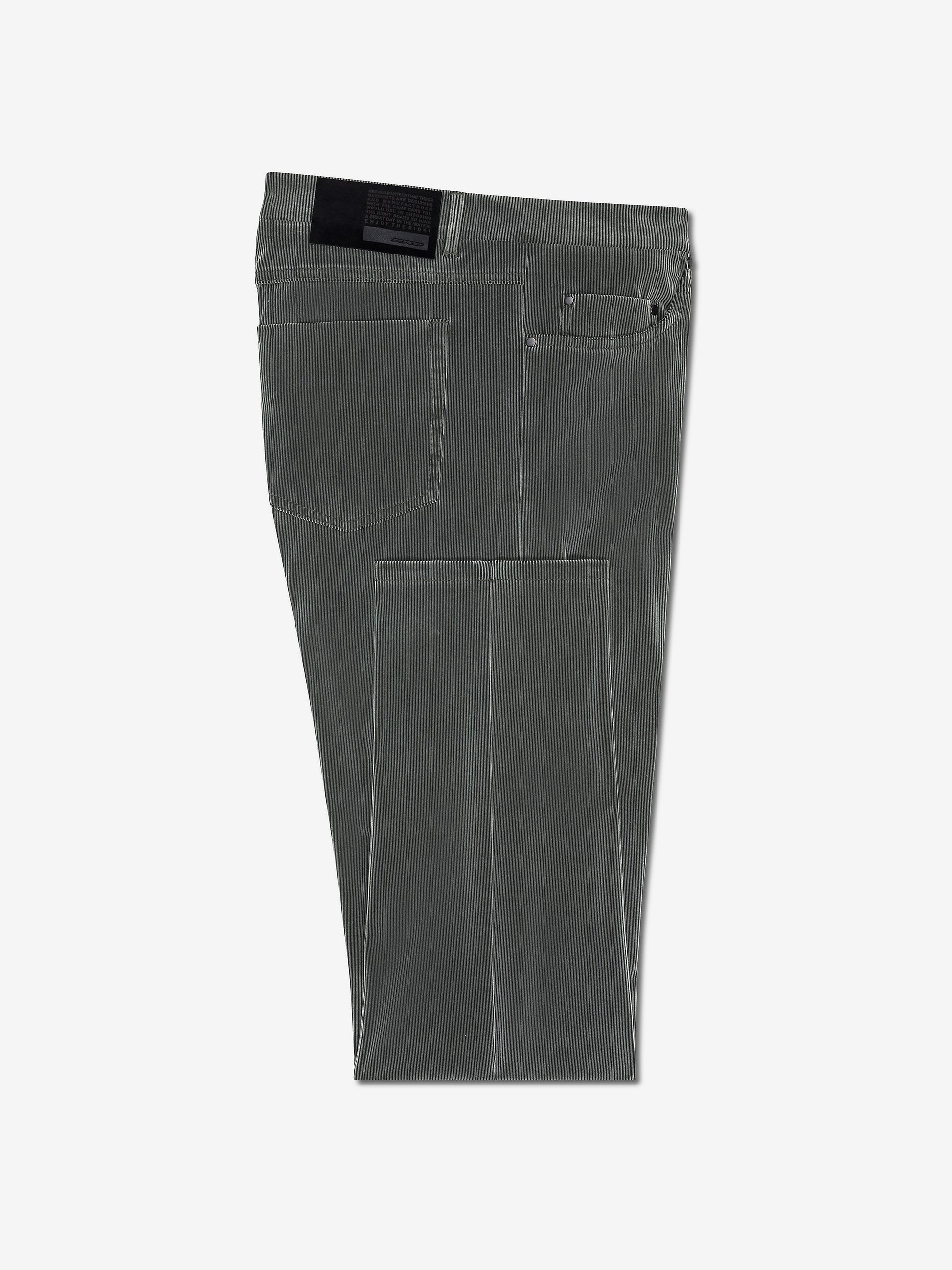 Lo spirito casual dei pantaloni cinque tasche si riflette nella lavorazione floccata a effetto velluto millerighe del tessuto stretch SURFLEX® di media grammatura stampato con pigmenti delavé, che asseconda il comfort della vestibilità slim. Il modello presenta sul davanti le tipiche tasche arrotondate, complete di watch pocket, e le due a toppa posteriori, impreziosite dal jacron nero RRD. La chiusura sul davanti in pregiati bottoni in corno è nascosta dalla patta. La cintura e la bottoniera interne stampate nell'esclusivo Monogram Razzle Dazzle nero e la raffinata lucentezza tridimensionale costituiscono un ulteriore dettaglio di stile. La morbidezza al tatto si aggiunge alle qualità antipiega ed easy care di Velvetflex 1000 5T Pant, disponibile in un'ampia palette di toni di stagione per completare con naturalezza diversi look informali.