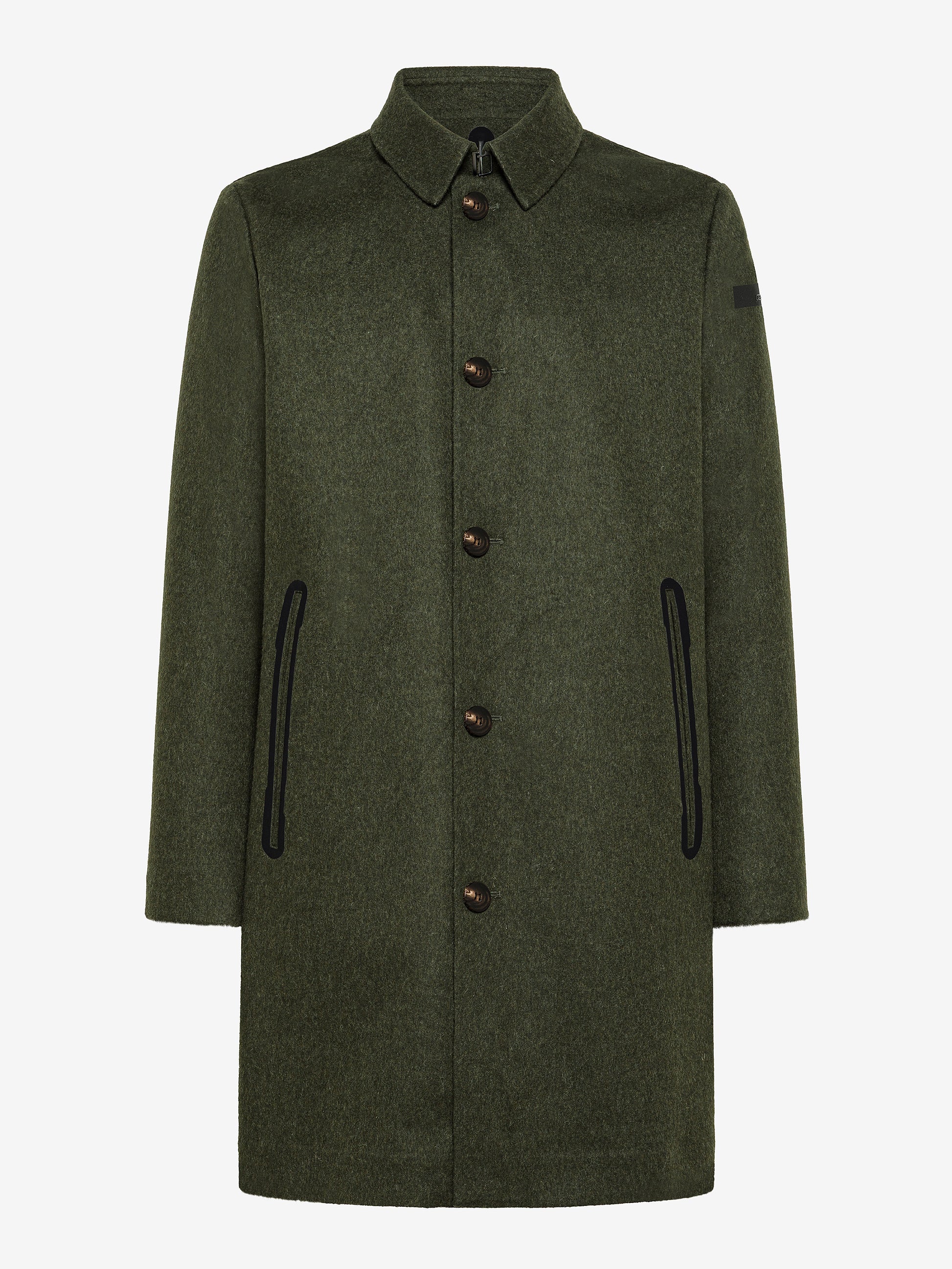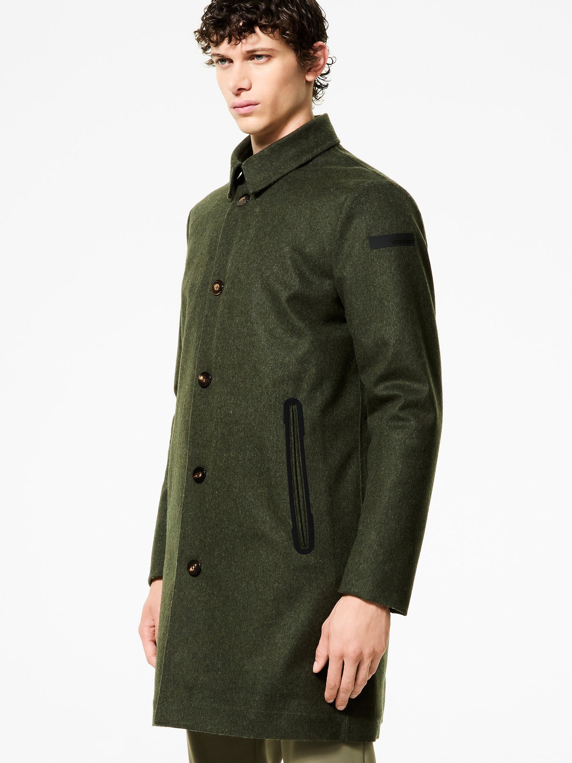 Il soprabito loden dal fit regolare si distingue per il consistente tessuto a membrana traspirante, con esterno in pregiato panno di lana Moessmer verde foresta, e per la costruzione interamente termonastrata. Fra classicità e innovazione tecnologica, il capospalla è impreziosito da dettagli sartoriali come il colletto a camicia chiuso dal gancio metallico e la pregiata abbottonatura in corno, che gioca un moderno contrasto di finiture con la termonastratura nera che sottolinea le ampie tasche laterali. La soffice e calda imbottitura in piuma d'anatra 90/10 è contenuta nel tubico "square", che previene la fuoriuscita del materiale. L'innovativo sistema Floating Shield garantisce una portabilità impeccabilmente diritta e confortevole. Lo spacco centrale posteriore agevola la libertà di movimento. L'interno presenta un taschino chiuso dalla zip invisibile, ravvivato dal doppio filetto arancione fluo e dalla tag a cuore "Made with love, designed in Tuscany". Il logo a microiniezione nero sulla manica sinistra conferisce un'ulteriore nota di stile a un modello che attraversa i tempi e i trend con studiata eleganza.