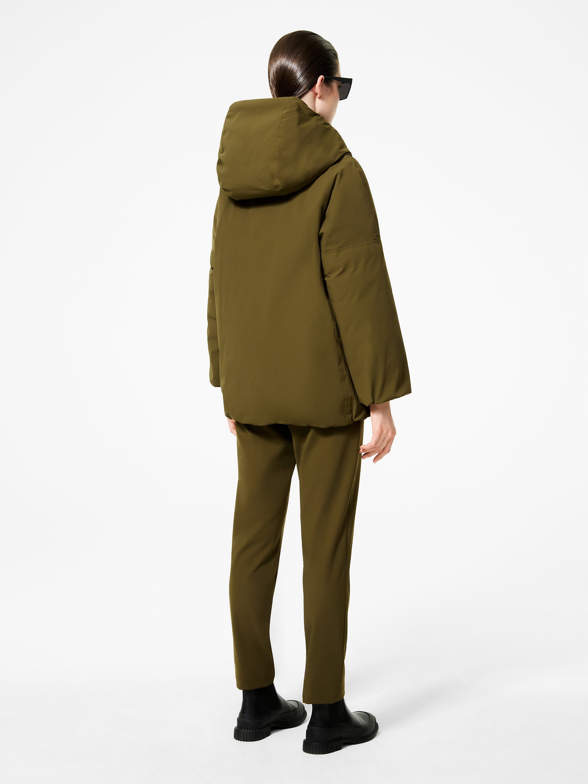 Il parka, che si poggia delicatamente ai fianchi, presenta un taglio over di tendenza. Il cappuccio avvolgente, regolabile con le discrete coulisse elastiche, aggiunge comfort e protezione esaltandone l'attitudine urban. Le coulisse elastiche presenti sul fondo della giacca consentono di modellare la silhouette secondo l'effetto desiderato, creando una linea a ovetto ideale per la donna che ama giocare con le proporzioni e le forme. Realizzato in tessuto a membrana traspirante, il capospalla presenta il finish opaco dell'esterno in esclusivo Montecristo. I canali tubici privi di impunture contengono la calda e morbida imbottitura in piuma d'anatra. La chiusura a zip gommata, le tasche dotate di zip invisibili e il logo a microiniezione sulla manica sinistra sono le note di stile che ne impreziosiscono il design minimal e rendono il capo versatile. Perfetto per la donna che ama un capospalla contemporaneo, il parka può essere abbinato a una maglia in velluto con scollo a V e al pantalone a sigaretta con tasca alla francese, nella creazione di un look grintoso.