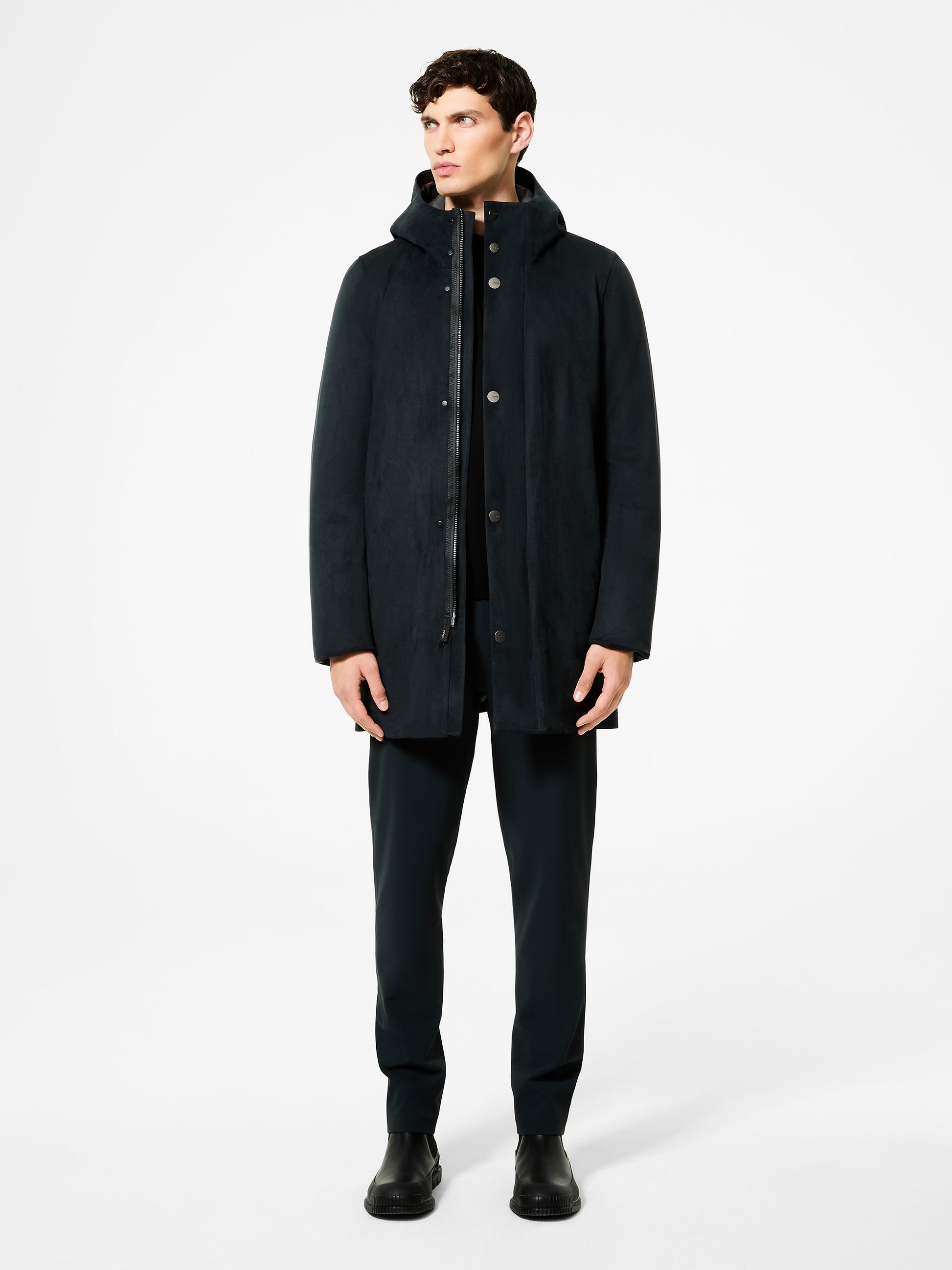 Il design eskimo di lunghezza trequarti è impreziosito dal look traslucido del pregiato eco suede a effetto nabuk, particolarmente morbido al tatto. La costruzione interamente termonastrata del tessuto a membrana traspirante presenta il caldo comfort dell'imbottitura in morbida e leggera piuma d'anatra 90/10. Questa è racchiusa nei canali tubici dell'innovativo sistema Floating Shield, che consente un fit impeccabilmente diritto al capospalla. Sul davanti, la patta con bottoni metallici a pressione nasconde alla vista la zip integrale metallica, che chiude il colletto alto e protettivo con il cappuccio fisso e imbottito. Le ampie tasche laterali a pistagna sono dotate nella destra del pratico tiretto elastico. L'interno presenta un taschino con zip invisibile, ravvivato dal doppio filetto arancione fluo e dall'iconica tag a cuore "Made with love, designed in Tuscany". Il logo a microiniezione nero sulla manica sinistra è la nota distintiva di un capo dall'eleganza ricercata, adatto a ogni circostanza.