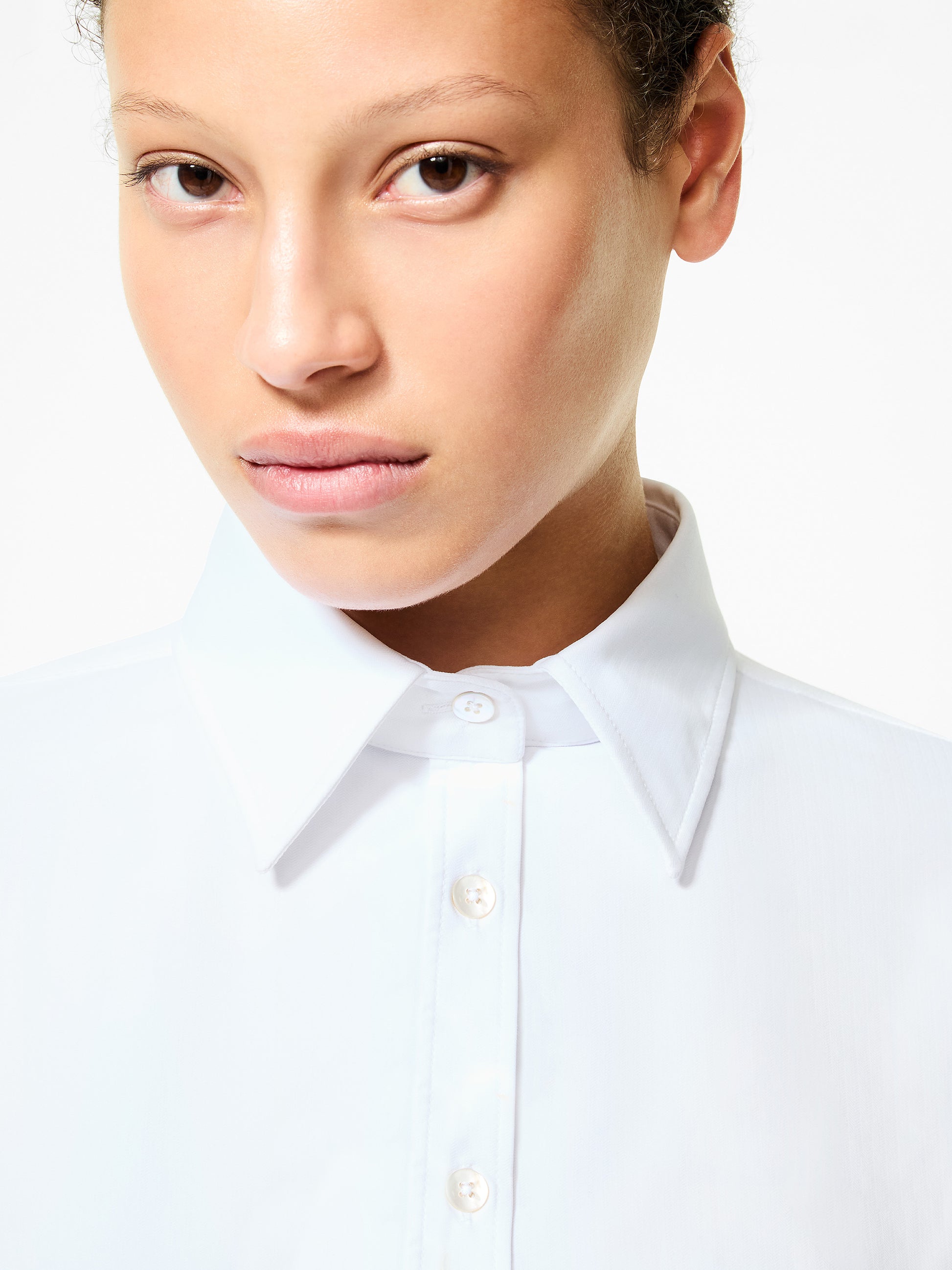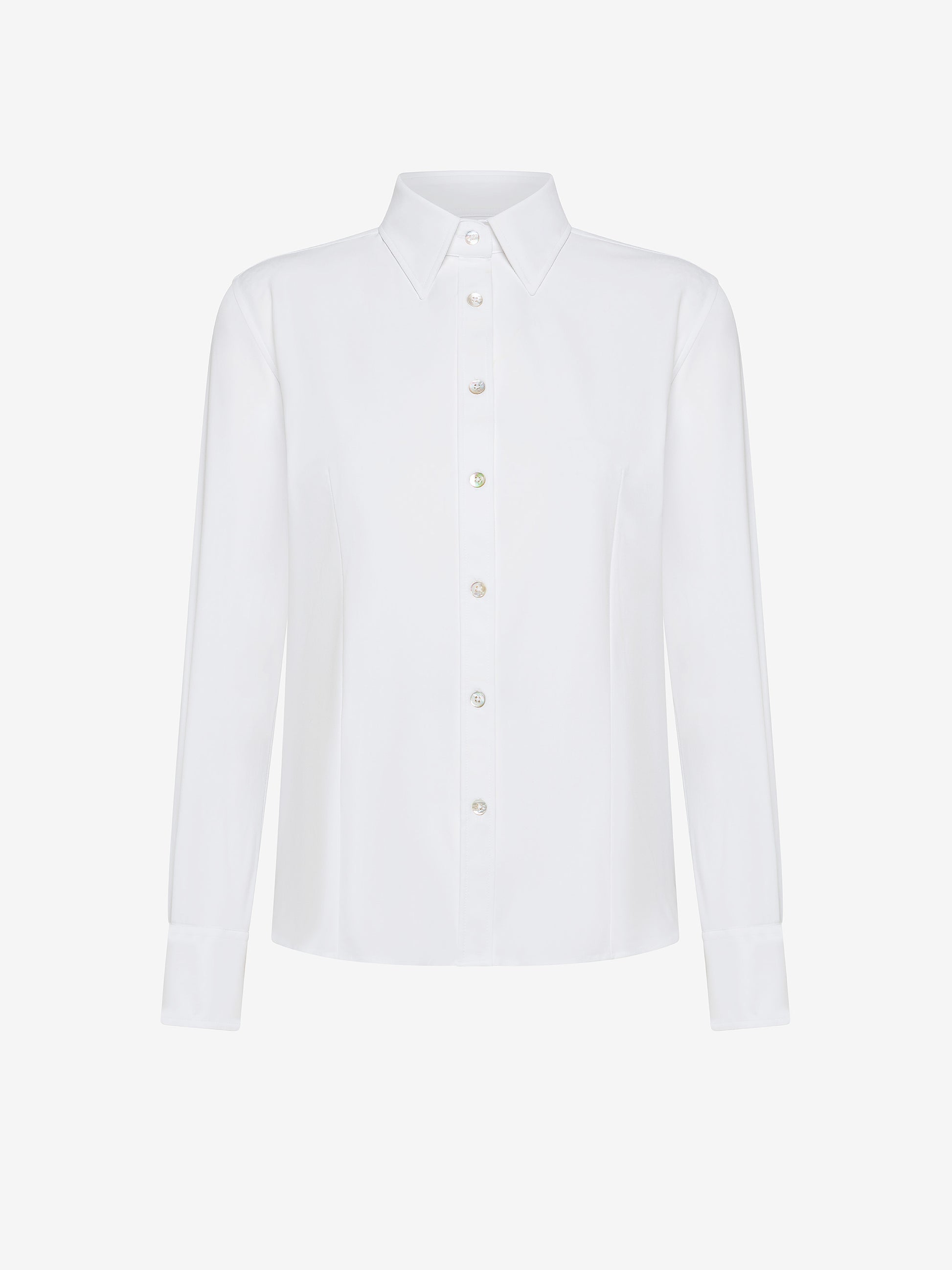 La classicità maschile si rinnova in chiave femminile con questa camicia in Oxford elasticizzato, impreziosito dalla raffinata lavorazione jacquard che dona profondità materica e sobria luminosità. La costruzione sartoriale, sapientemente calibrata, si distingue per la linea strutturata e la vestibilità impeccabile. La leggera sciancratura in vita ammorbidisce il taglio delineando con grazia la silhouette, mentre le pinces al petto valorizzano con delicatezza la forma. I bottoni in vera madreperla, discreti e preziosi, aggiungono un dettaglio distintivo che sigla l’eleganza dell’insieme. Una creazione dall’eleganza senza tempo, questa camicia rivela tutta la sua versatilità se abbinata a un pantalone palazzo in eco suede, nel creare un look sofisticato e dinamico. Grazie alla sua leggerezza, al comfort e alle qualità antipiega ed easy care, è perfetta per attraversare con stile ogni momento della giornata e in viaggio.