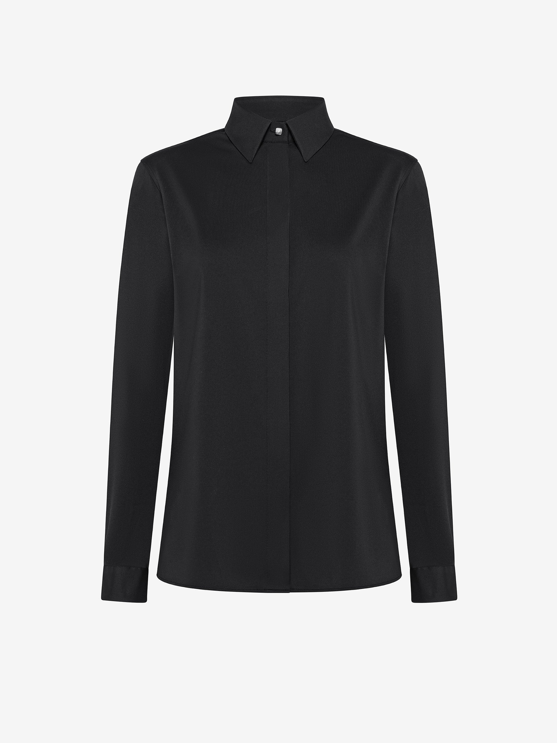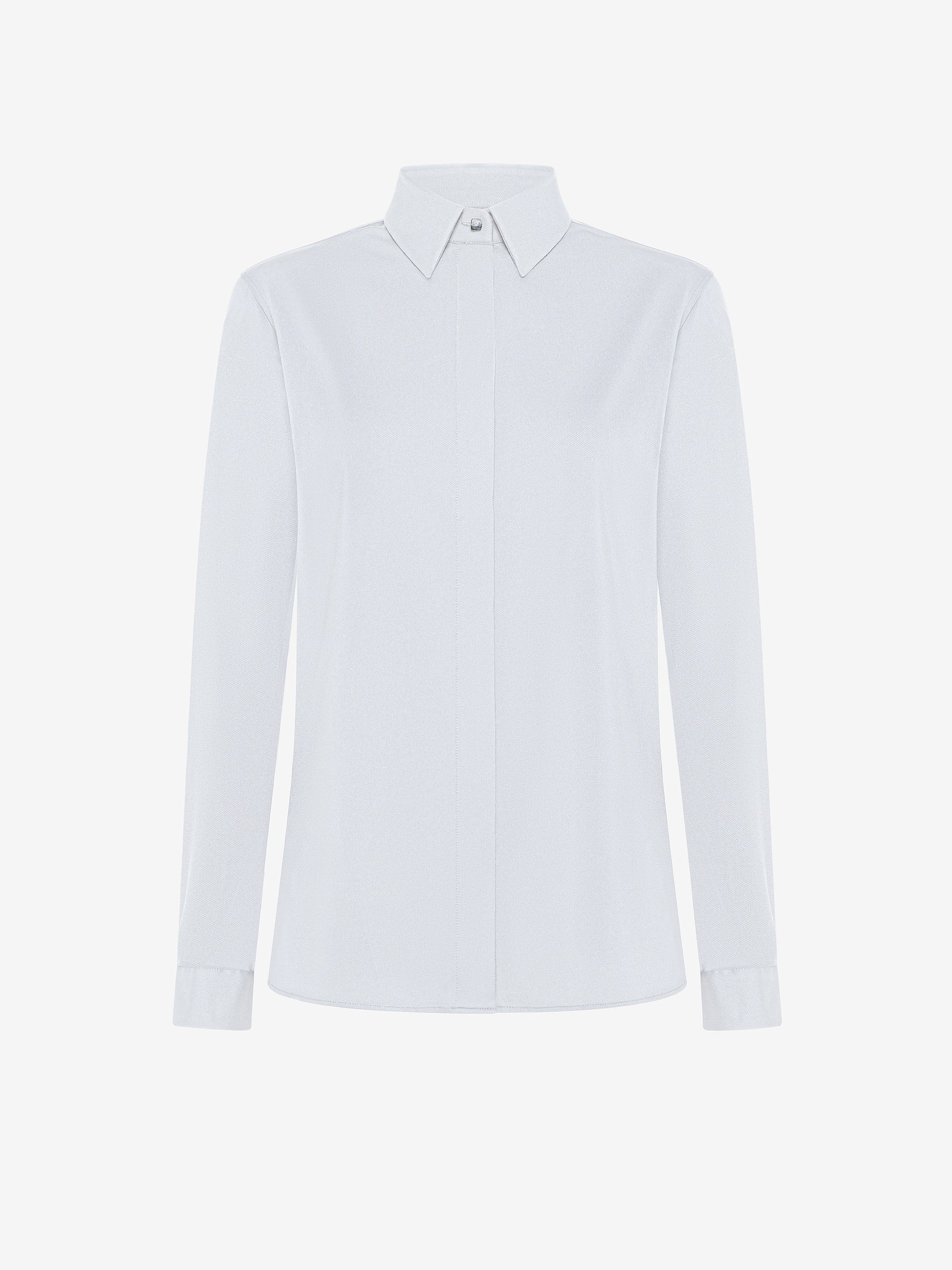 La camicia cattura l'essenza del design minimalista e sofisticato, in equilibrio perfetto tra rigore sartoriale e spirito contemporaneo. Confezionata in pregiato tessuto Oxford elasticizzato, leggero, traspirante ed easy care, presenta dettagli che esprimono una visione di eleganza che si afferma con discrezione. Il colletto all'italiana, chiuso da un singolo bottone in madreperla, incontra l'abbottonatura celata sotto la patella, in un gioco di linee essenziali. L'attitudine decisa del capo trova la sua espressione più compiuta se abbinata a un blazer doppiopetto dalla costruzione maschile, per un look urban chic che unisce autorevolezza e raffinatezza. La camicia è ideale anche in viaggio, grazie alle sue proprietà anti piega e no stiro.