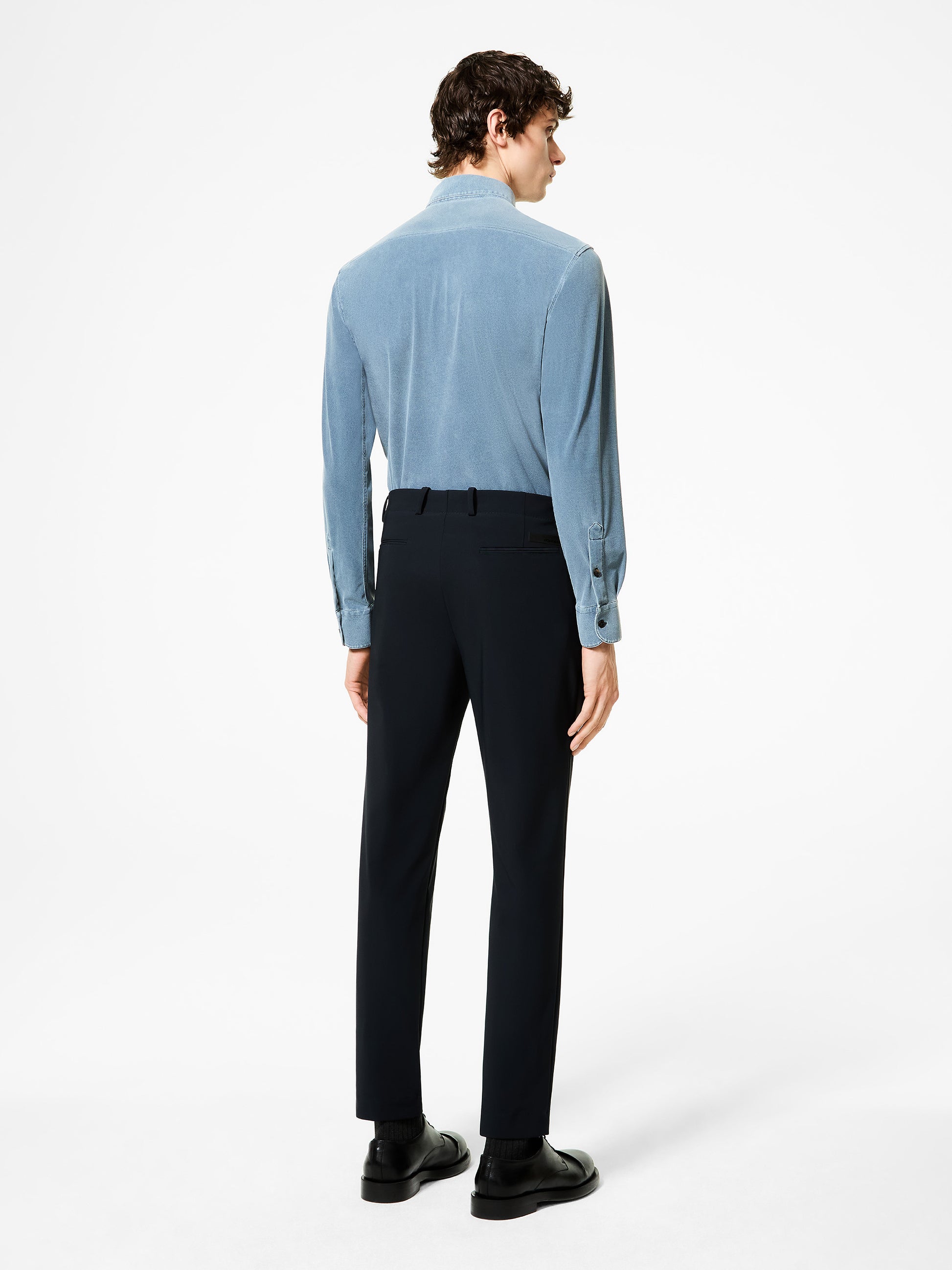La camicia monocroma a maniche lunghe dal fit regolare si distingue per l'esclusivo piquet elasticizzato in cotone e nylon, morbido al tatto e dal delicato effetto delavé. La tridimensionalità del tessuto si unisce con naturalezza alle note di stile classico come il colletto regolare, l'abbottonatura alla francese in madreperla sul davanti e i bottoni coordinati sui polsini. Le qualità antipiega e no stiro rendono la camicia particolarmente adatta a conferire una nota di ricercata originalità all'outfit, nel valorizzare i capi smart casual della collezione.