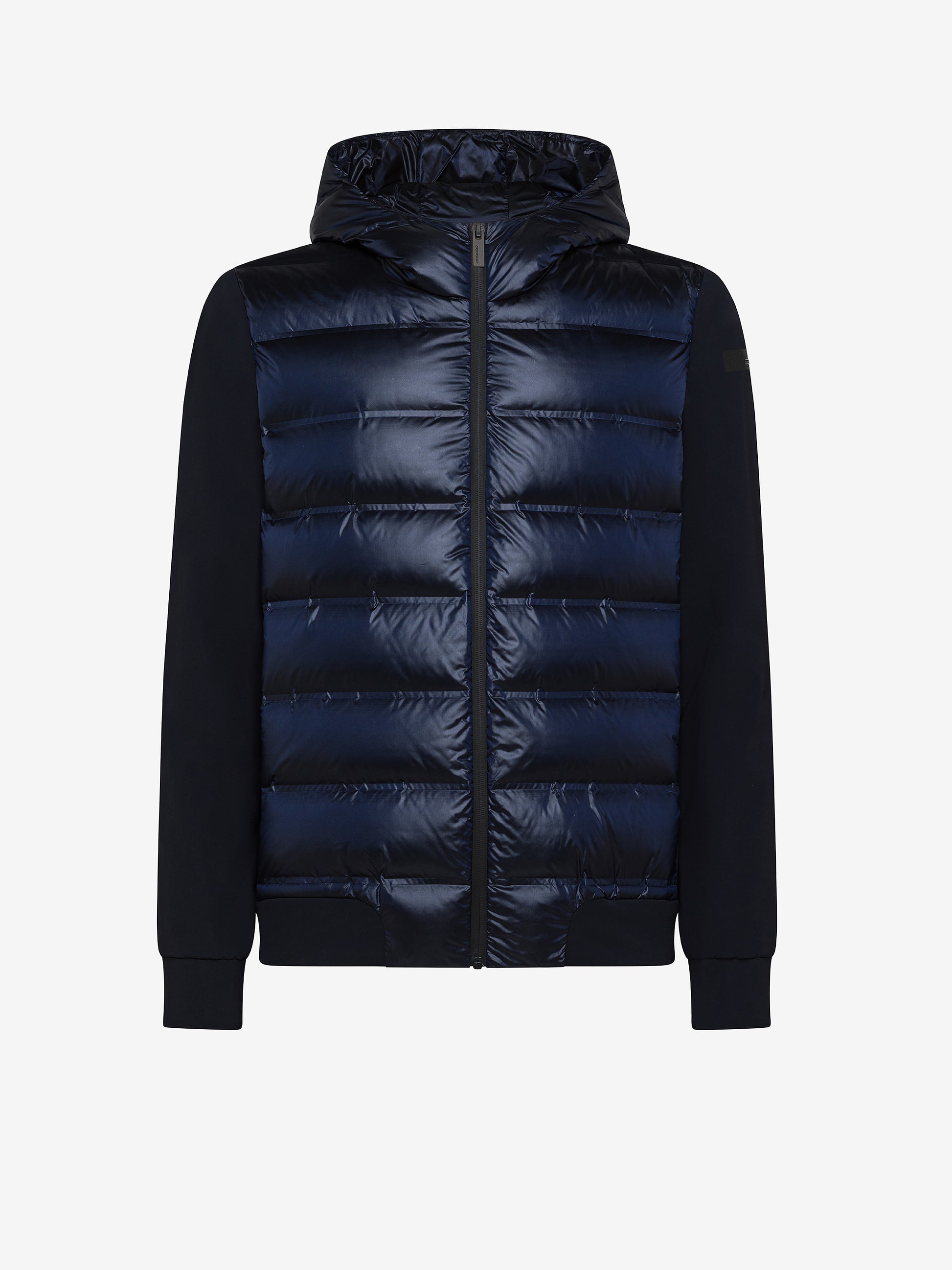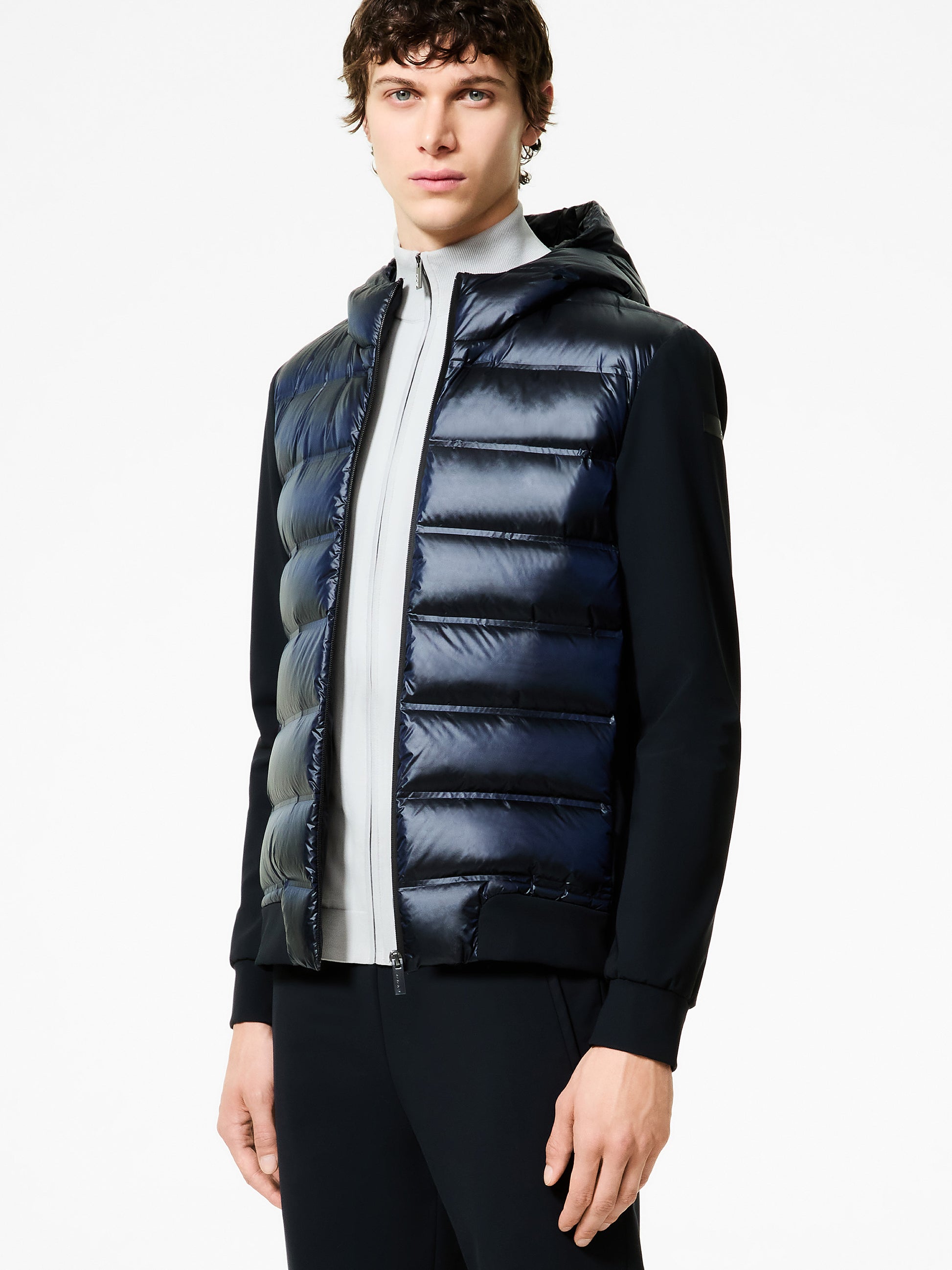 Questa soft jacket con cappuccio imbottito interpreta con stile originale il concetto di versatilità contemporanea attraverso una costruzione ibrida e funzionale. Il davanti presenta la texture priva di impunture dei canali tubici, resistenti a vento e pioggia, che contengono la calda e leggera imbottitura in piuma d'anatra 90/10. Il dorso, le maniche, i polsi e il fondo sono realizzati in esclusivo SURFLEX® elasticizzato, dal look super opaco e antipiega. La silhouette è slanciata dalla zip, affiancata dalle tasche laterali con chiusura invisibile, che completano il design dinamico ed essenziale. All'interno, il taschino con zip invisibile è impreziosito dai dettagli distintivi della doppia nastratura arancio fluo e la tag a cuore "Made with love, designed in Tuscany". Il filetto arancione sul retro e il logo a microiniezione nero sulla manica sinistra completano con una nota emblematica la creazione, ideale per vivere la città e il tempo libero con attitudine sportiva e sofisticata.