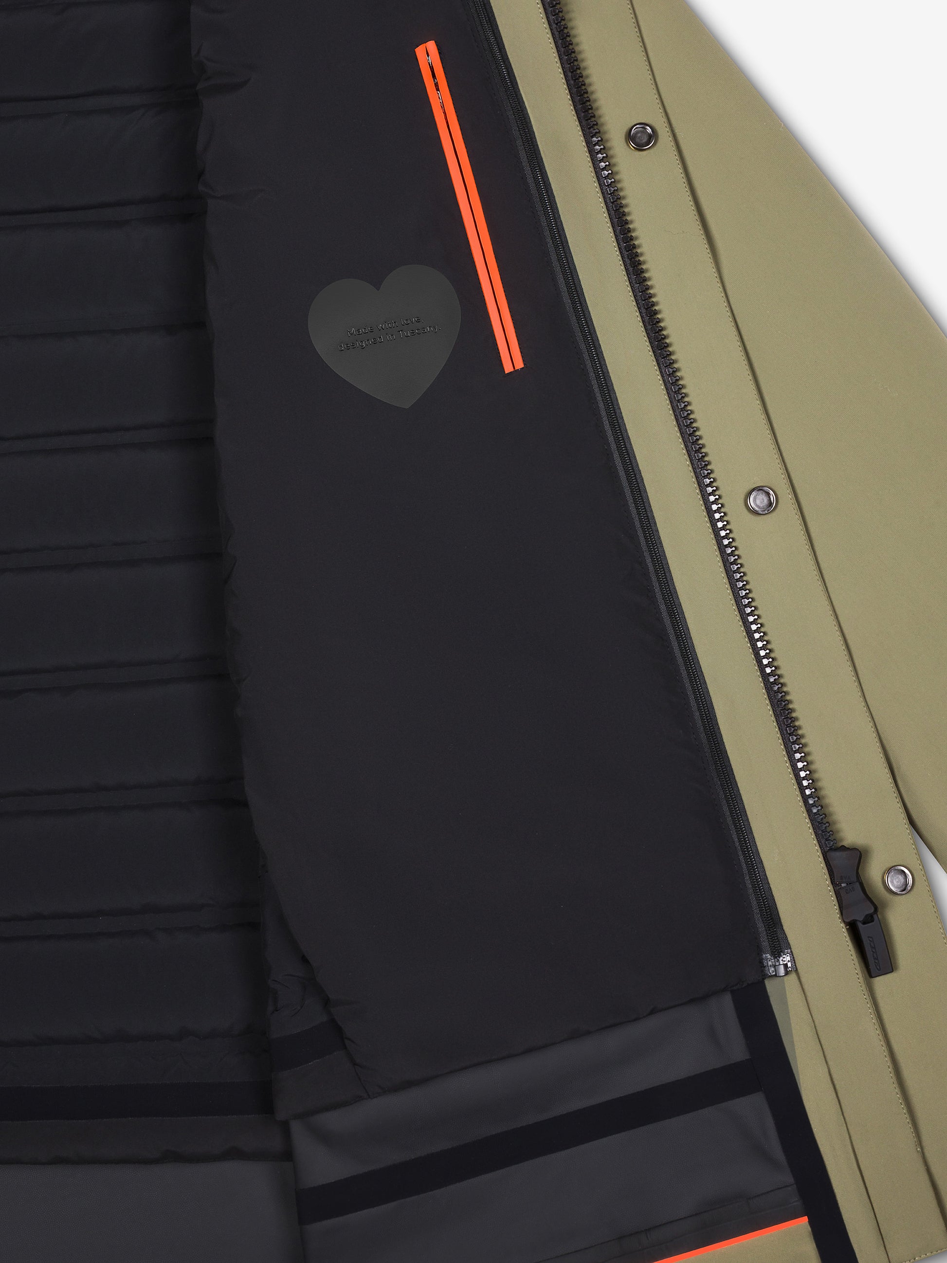 Il design essenziale, la modernità e la raffinatezza della costruzione distinguono questo capospalla di lunghezza media caldo e protettivo. Questa versione del classico parka invernale sottolinea la vocazione tecno sartoriale e l'estrema versatilità di utilizzo di un capo che può essere indossato sia nella mezza stagione, sia nei mesi più freddi grazie al cappuccio e all'imbottitura staccabili. Il modello in tessuto a membrana presenta il look super opaco dell'esterno in esclusivo SURFLEX®, stretch e piacevolmente morbido e liscio al tatto. Il davanti è caratterizzato dalla chiusura a zip doppio cursore, nascosta dalla pattina chiusa da bottoni a pressione soft touch. Il modello presenta diverse tasche, chiusa da ampie pattine, con i polsi regolati da bottoni a pressione soft touch. L'imbottitura staccabile in piuma d'anatra 90/10 è contenuta dai canali tubici, che prevengono la fuoriuscita del materiale. Il taschino interno con doppio filetto arancione fluo e la tag a cuore "Made with love, designed in Tuscany" si aggiungono al logo a microiniezione nero sulla manica sinistra, nel conferire ulteriori note iconiche a questo parka completo e versatile.