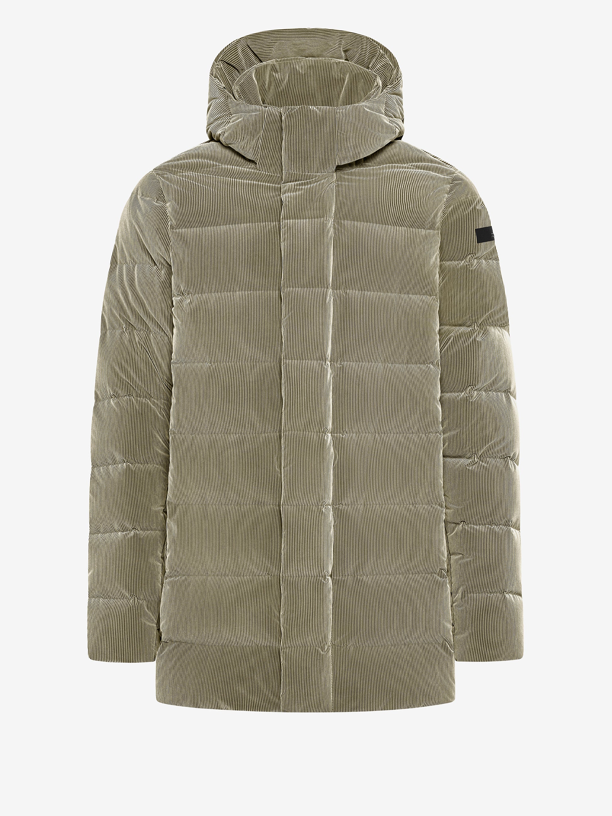 Caldo, leggero, confortevole: le qualità fondamentali di questo piumino di lunghezza media e dal fit regolare si sublimano nella bellezza e nella morbidezza del tessuto esterno floccato a disegno millerighe, dal piacevole touch vellutato. Il capospalla si caratterizza per il design nitido dei canali tubici: la loro assenza di impunture asseconda un look ancora più nitido e previene la fuoriuscita dell'imbottitura in soffice piuma d'anatra 90/10. All'efficace isolamento dal freddo e dalle intemperie si aggiunge la protezione del colletto alto e del cappuccio avvolgente, staccabile tramite zip. La purezza del design è enfatizzata dalla pattina chiusa dai bottoni a pressione invisibili, che nasconde la zip spalmata. Anche le comode tasche laterali sono chiuse da zip invisibili, mentre l'interno presenta il pratico taschino impreziosito dal doppio filetto arancione fluo e dalla tag a cuore "Made with love, designed in Tuscany". Il logo a microiniezione nero sulla manica sinistra conferisce un'ulteriore nota di stile iconico.