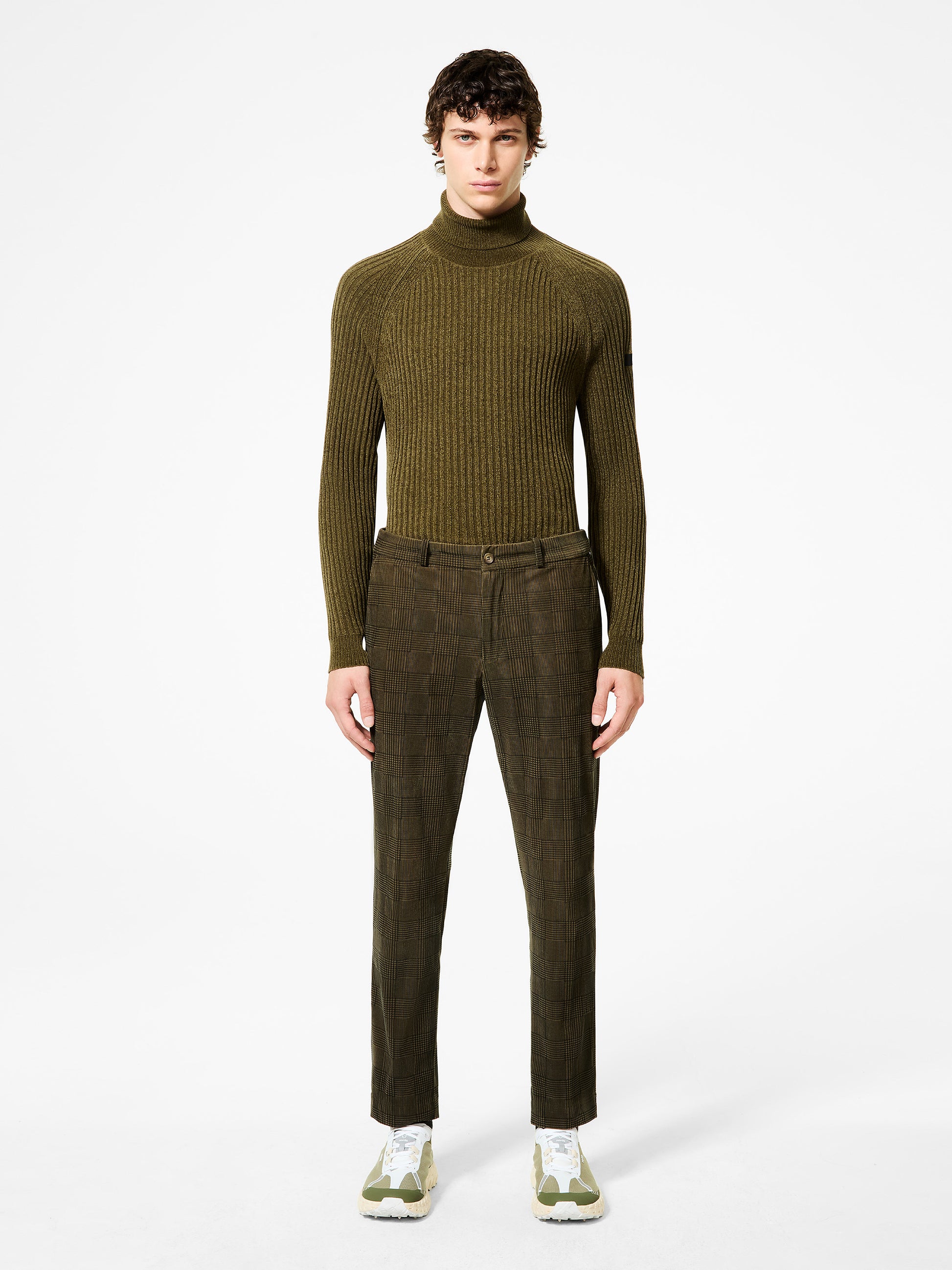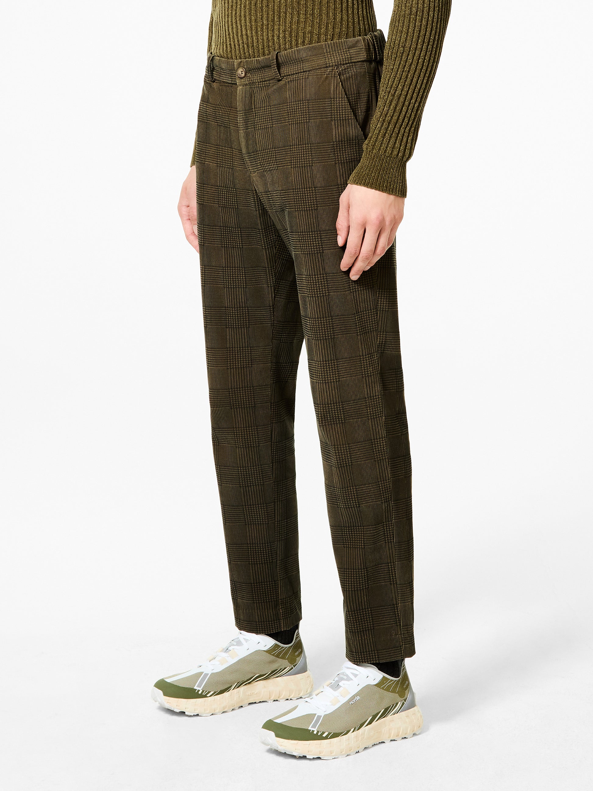 Il modello slim fit a vita regolare si distingue per la stampa allover negli eleganti motivi pied-de-poule e Principe di Galles sul tessuto elasticizzato SURFLEX® di media grammatura, floccato a effetto velluto millerighe. I pantaloni presentano una costruzione raffinata, con la vita regolata dalla coulisse interna e dotata di elastico per un comfort personalizzato, e la fascia interna stampata nell'esclusivo Monogram Razzle Dazzle Nero. Sul davanti, il modello presenta la cintura con passanti e le tasche alla francese, che affiancano la pregiata abbottonatura in corno nascosta dalla pattina. Il logo a microiniezione nero aggiunge una nota di stile inconfondibile alle tasche posteriori a filetto. La morbidezza al tatto e le qualità antipiega e no stiro rendono il modello particolarmente indicato per completare un look casual distintivo, in abbinamento a una maglia e un capospalla casual monocromo.